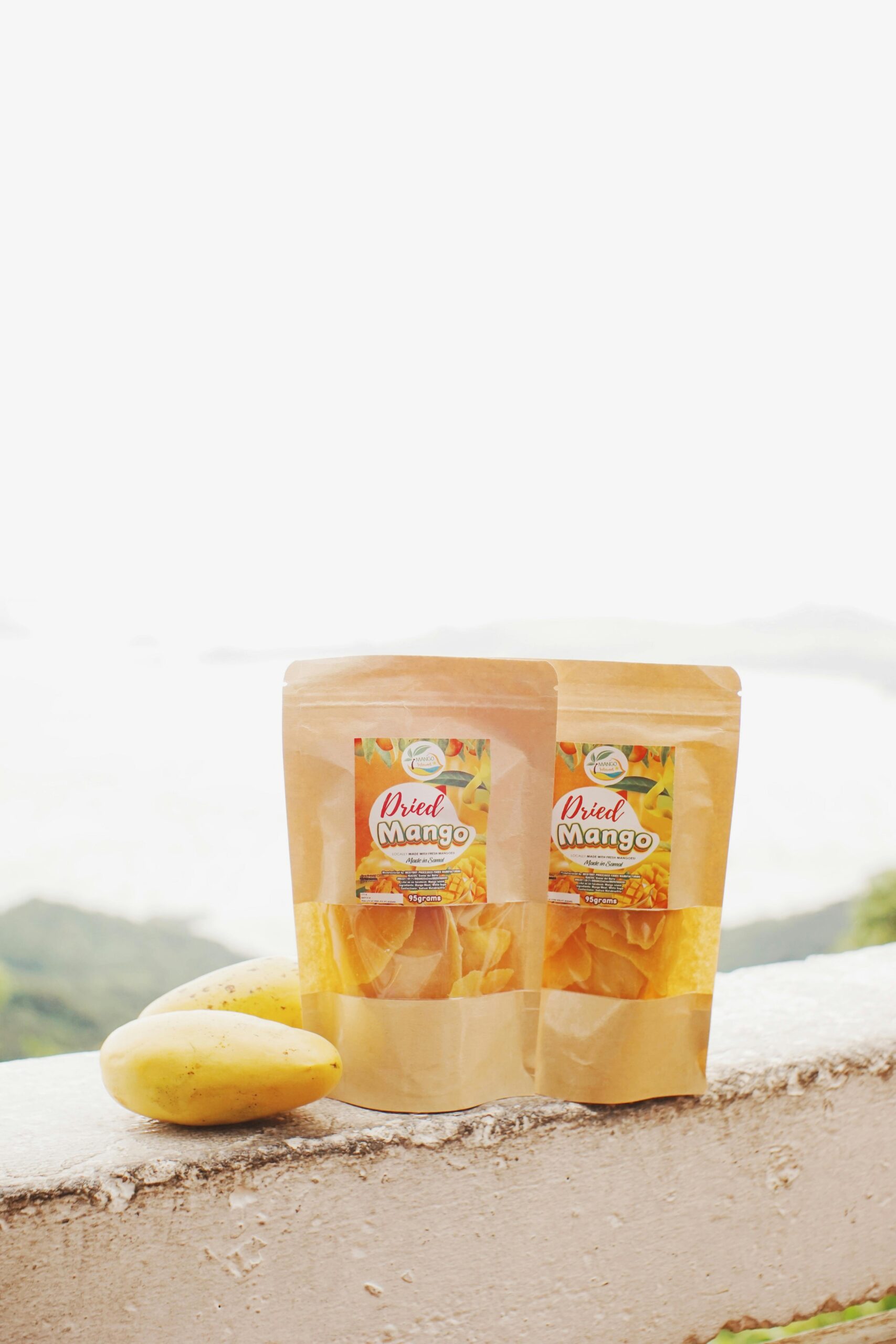 Tropical scenery showcasing packaged dried mangoes and fresh mangoes.Xoài Sấy Dẻo 100g – Premium